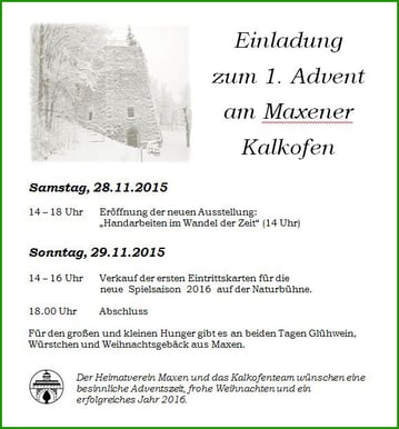 Advent am Kalkofen: Verkaufsstart Eintrittskarten Naturbühne Maxen 2016, Weitere Infos finden Sie unter "Aktuelles". |